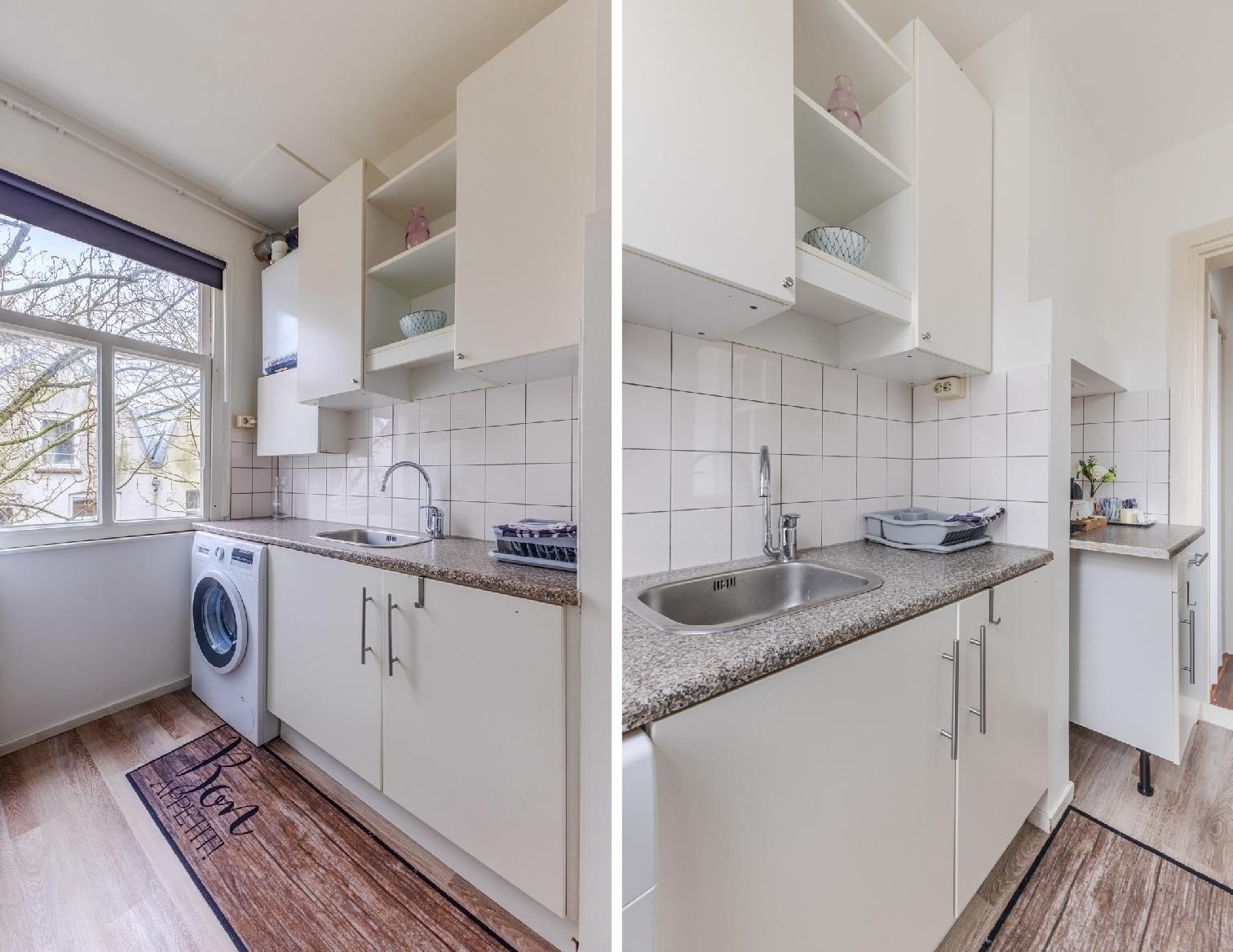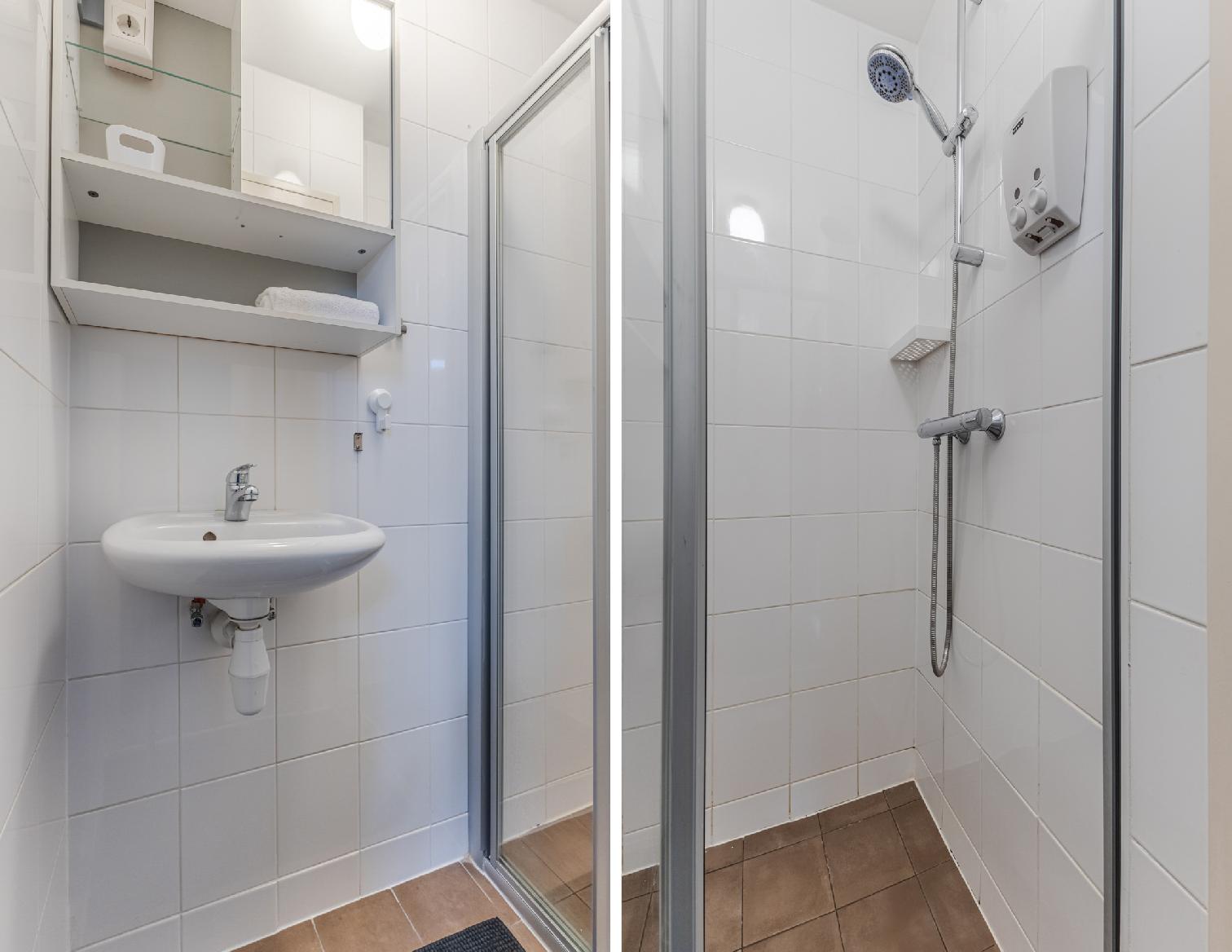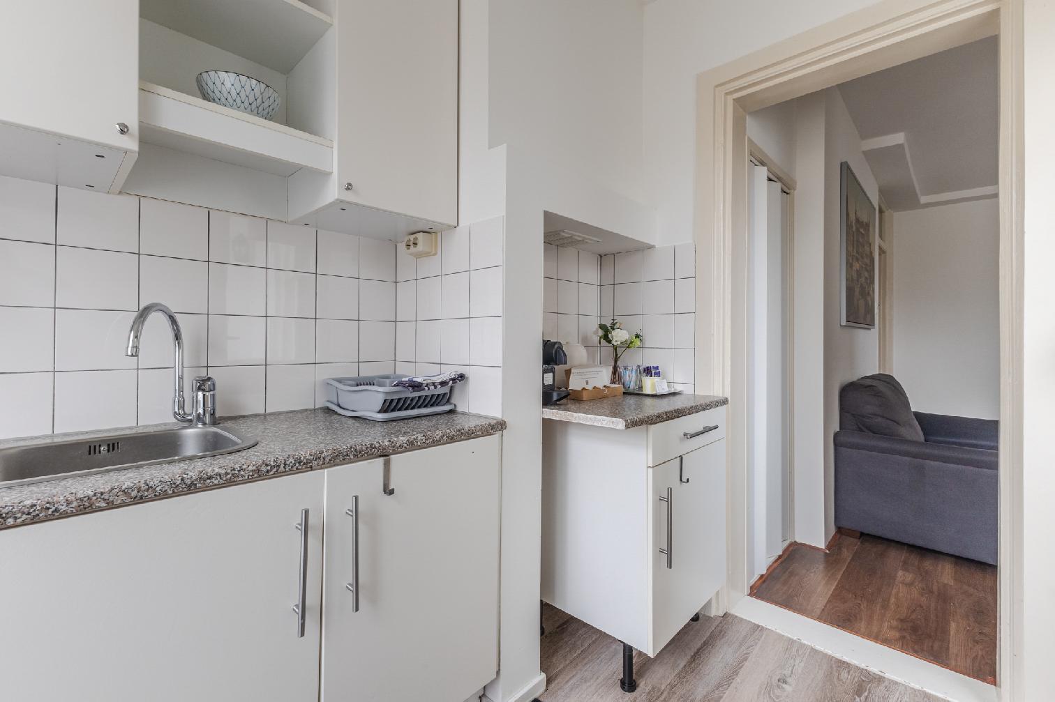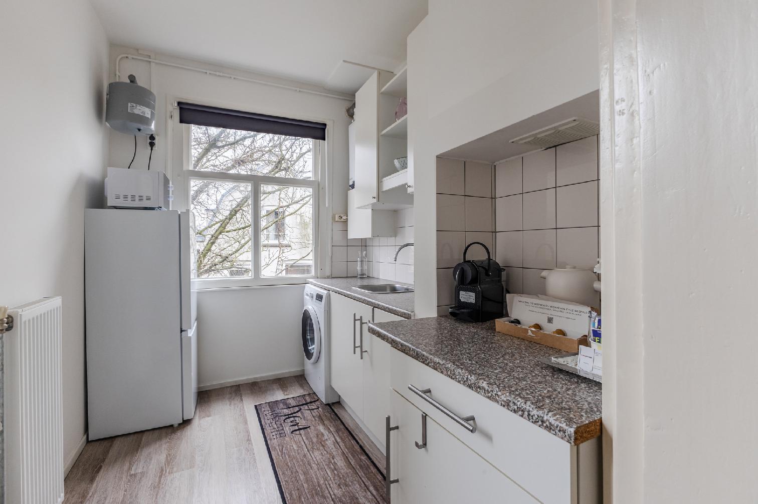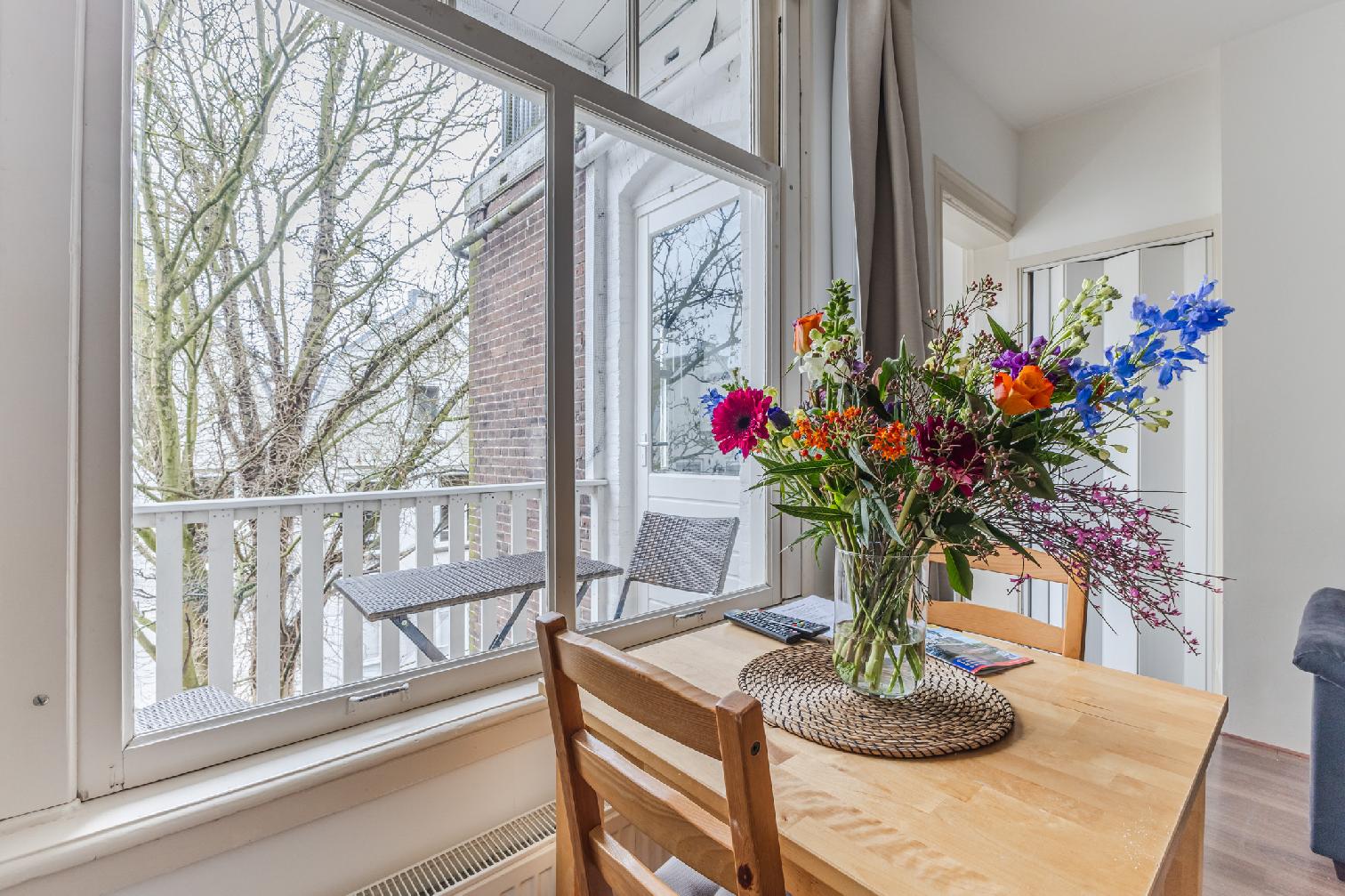 The residence boasts an authentic location in a popular neighbourhood brimming with cafes, restaurants, bars and boutiques. Tastefully furnished throughout, the studio benefits from beautiful wooden floors, plenty of natural light and a many modern amenities. The combined living and sleeping area comes equipped with double bed, large wardrobes, a coffee table, cosy rug, an impressive wall hanging. A flatscreen TV provided for the evening’s entertainment. The kitchen includes a fridge and freezer, offering the option of home dining during your stay. A small yet pleasant balcony allows you to enjoy the sunshine in peace. The bathroom contains a washbasin and a shower, with the toilet situated separately for added convenience. The studio also includes high speed Wi-Fi. Perfect for a family or two couples, the lodging ensures a memorable Amsterdam adventure.